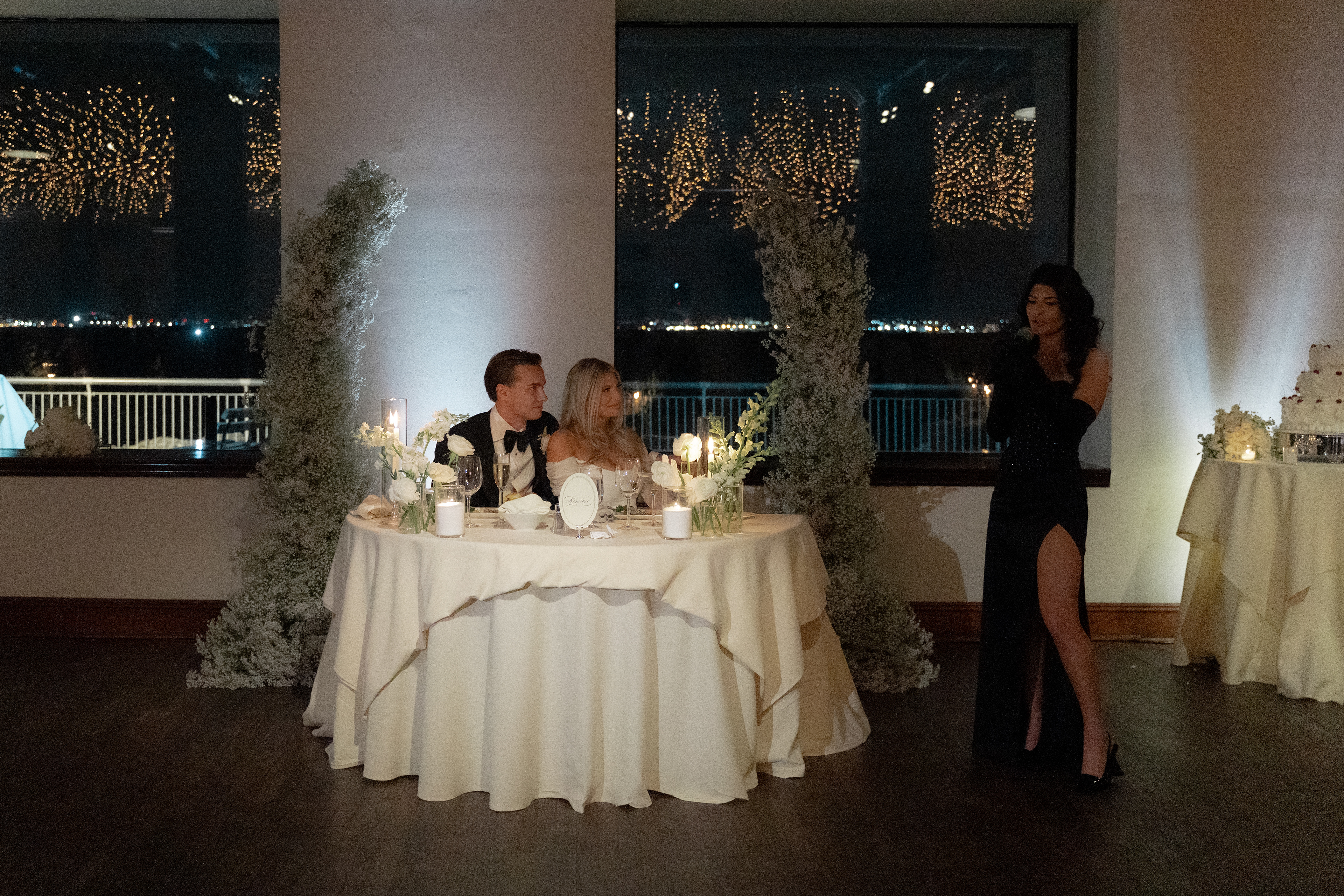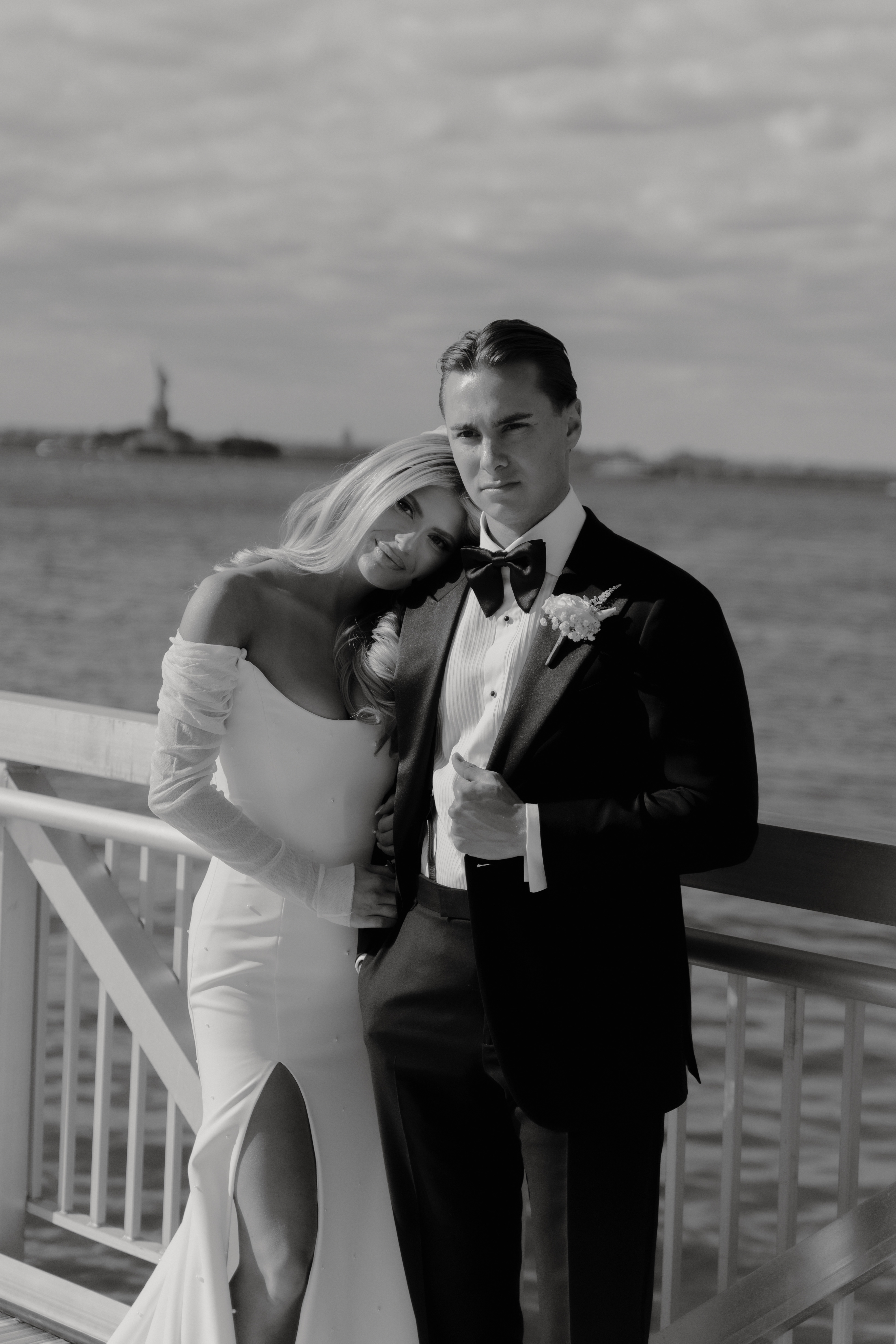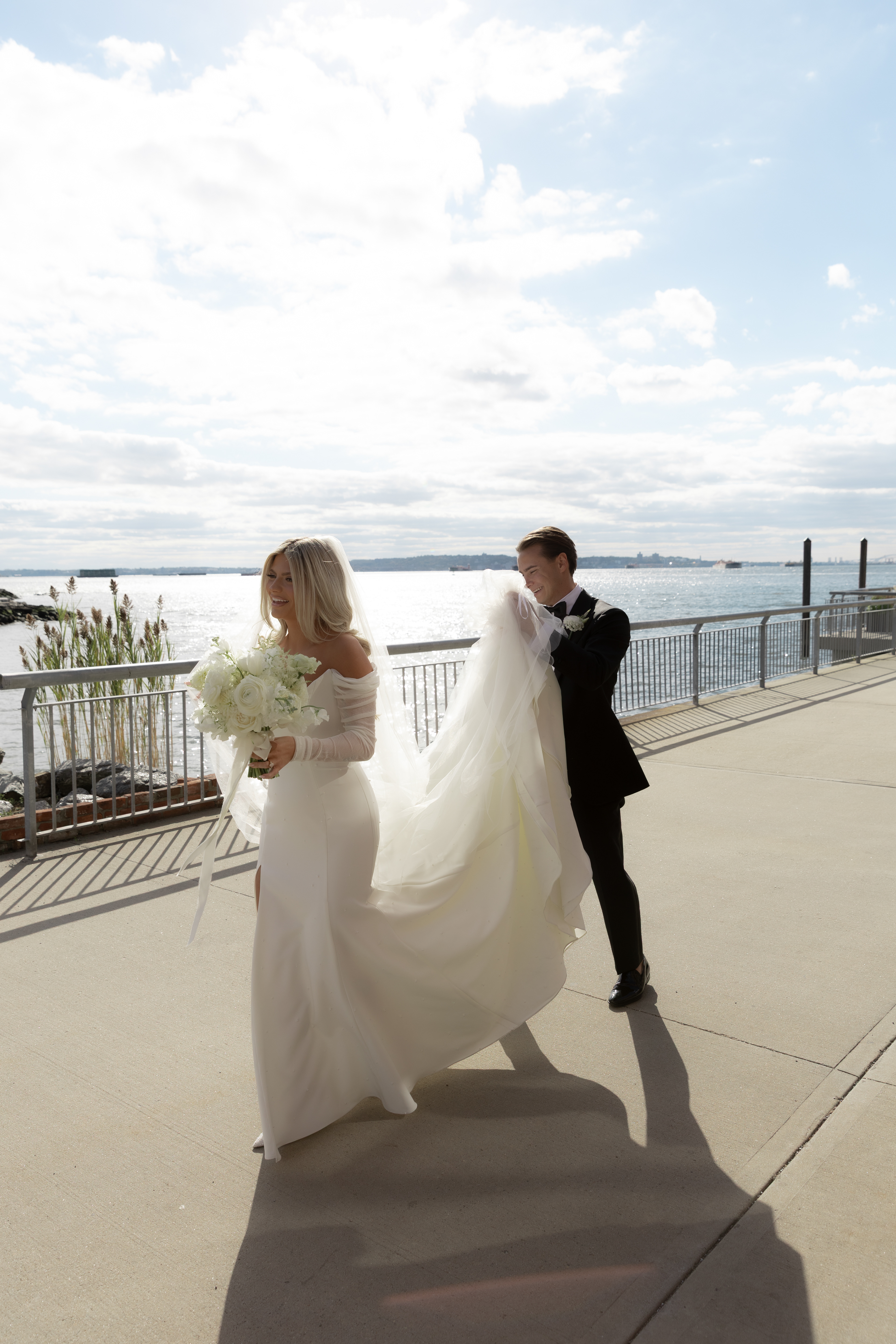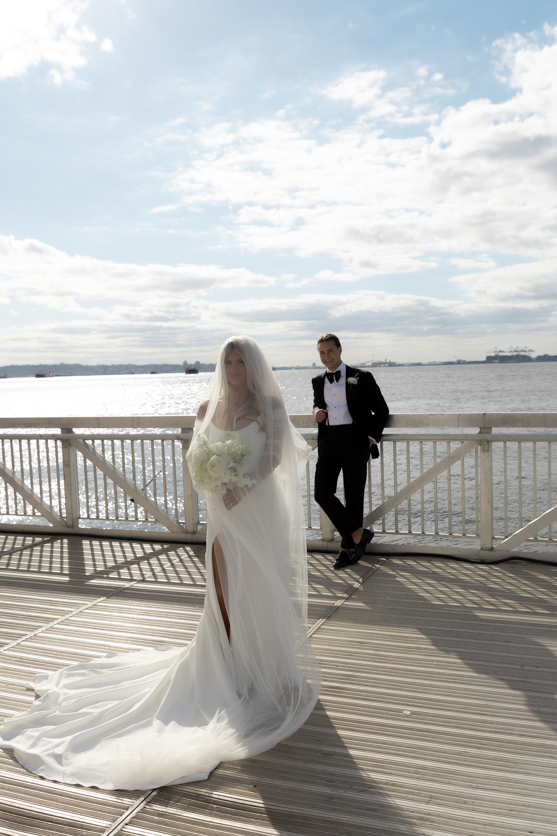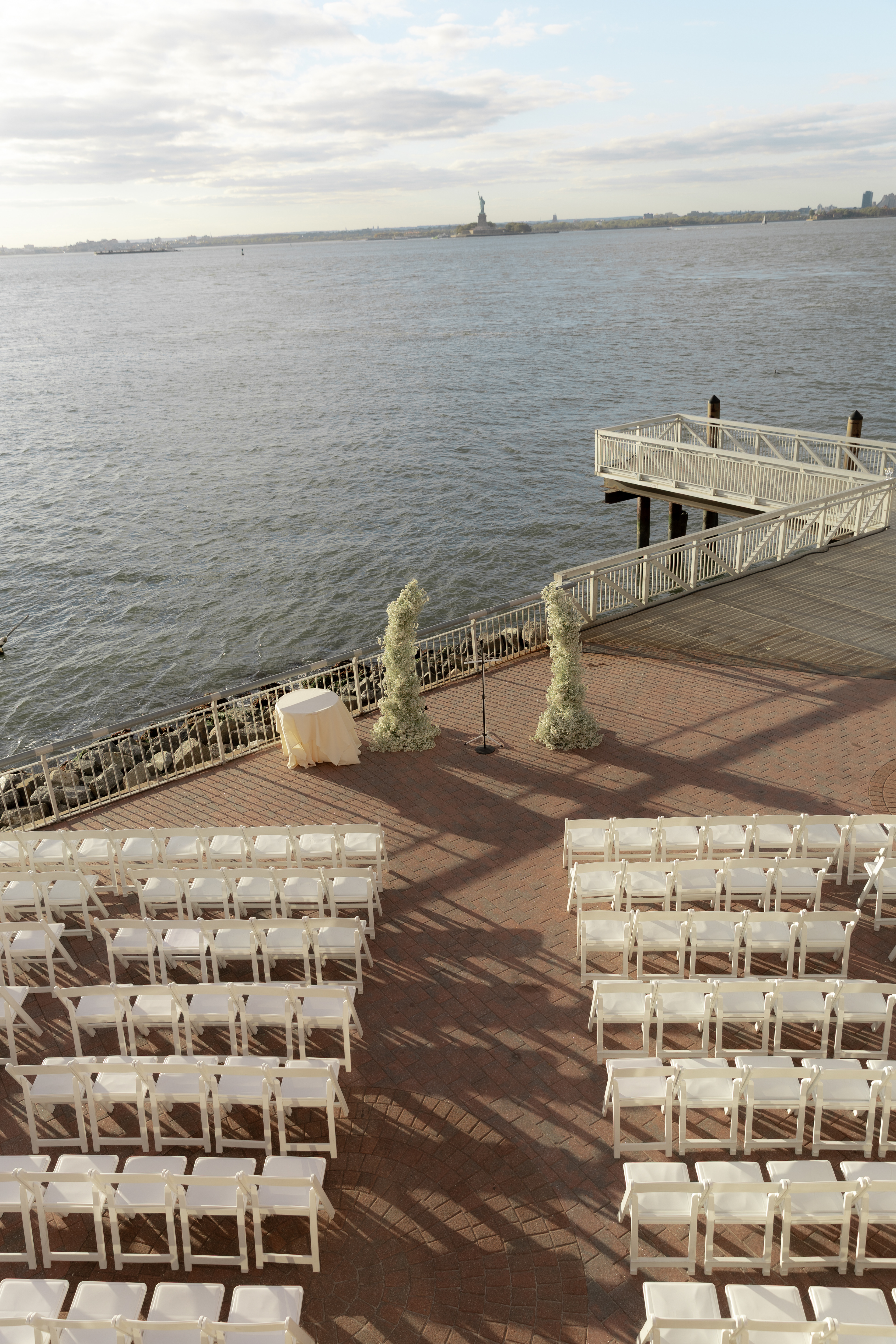 Their ceremony took place right on the pier, overlooking the harbor. The water was calm, and the skyline shimmered in the background as the sun started to dip. Guests sat facing the Manhattan view while Taylor walked down the aisle — it was one of those moments that felt still and cinematic all at once.