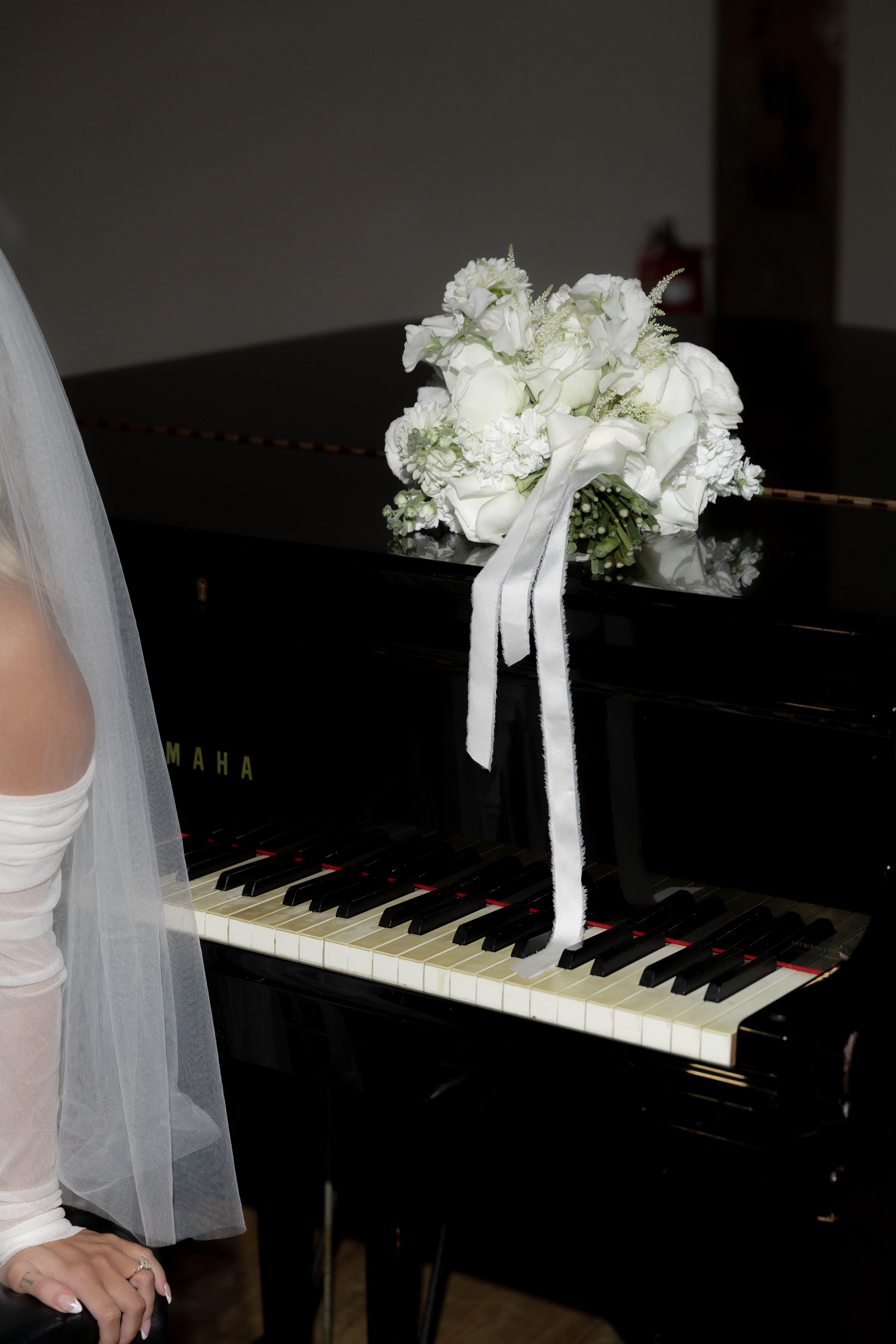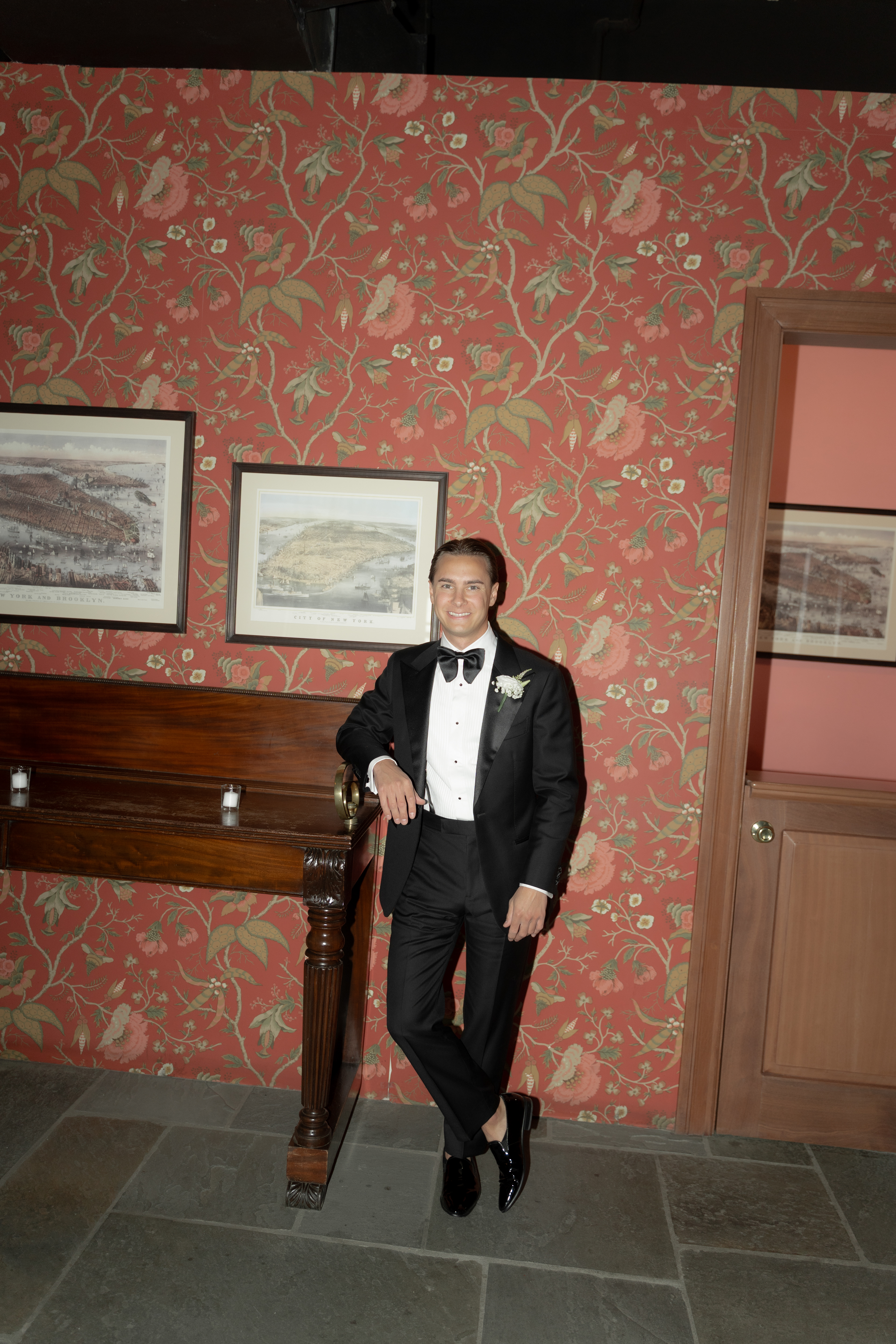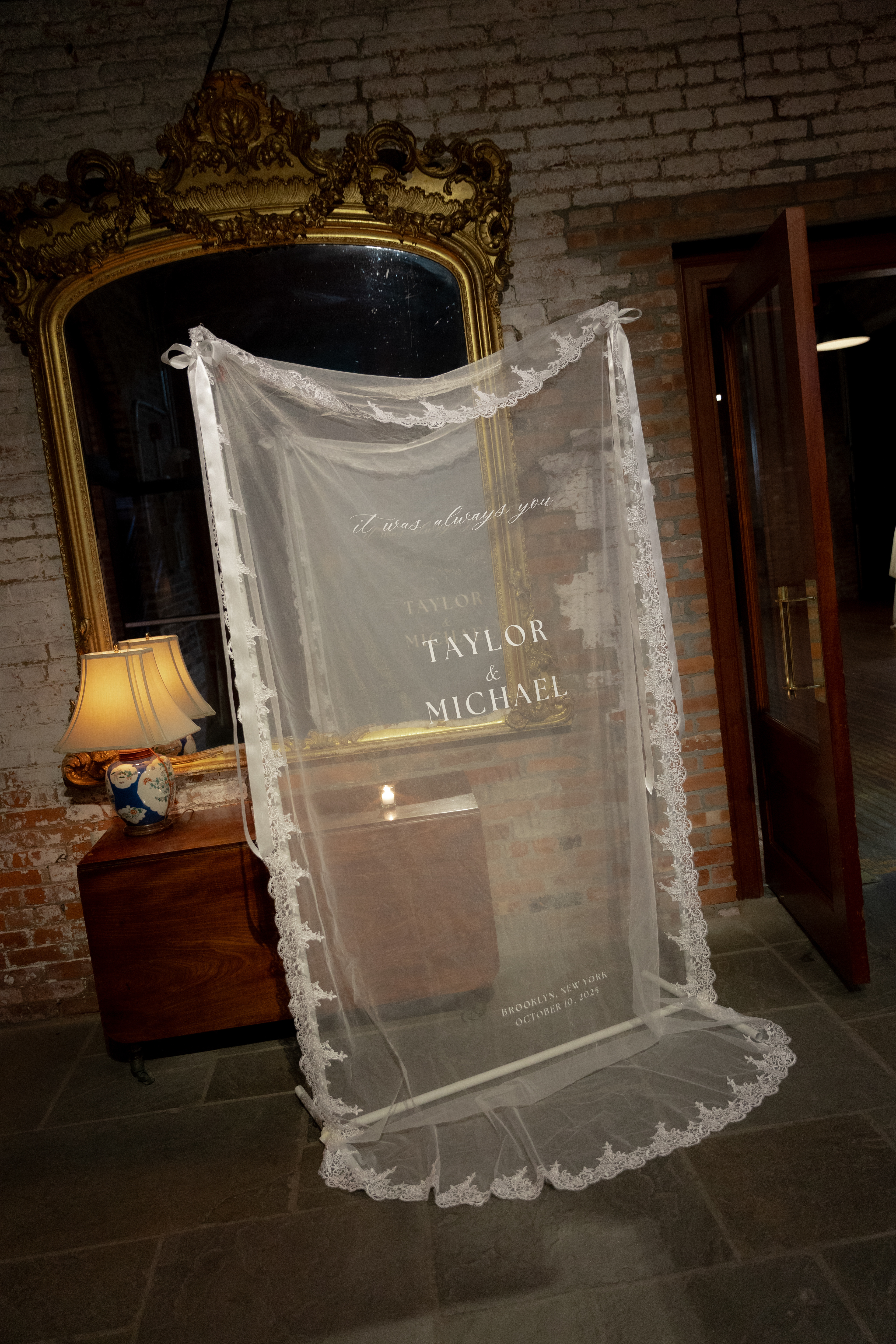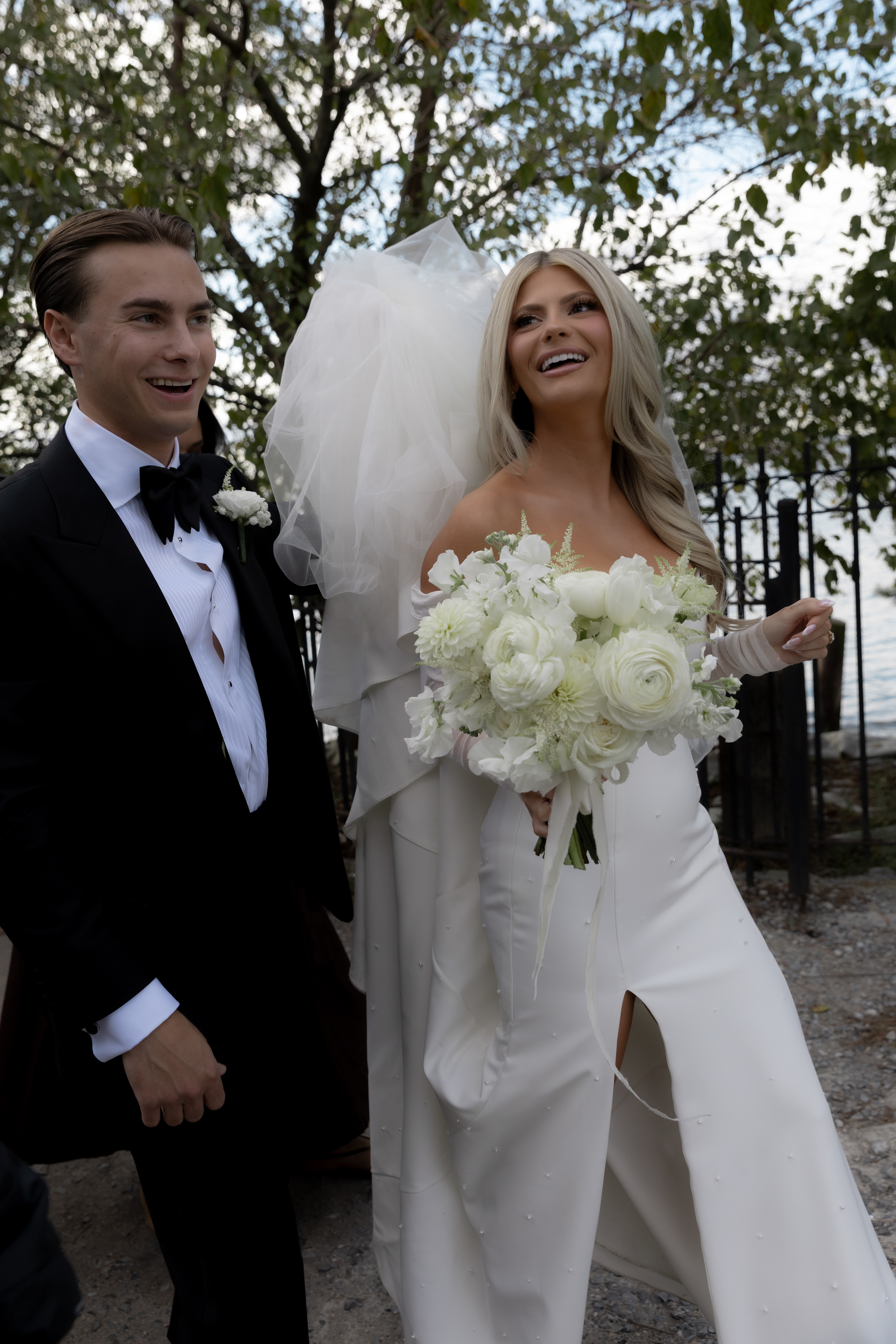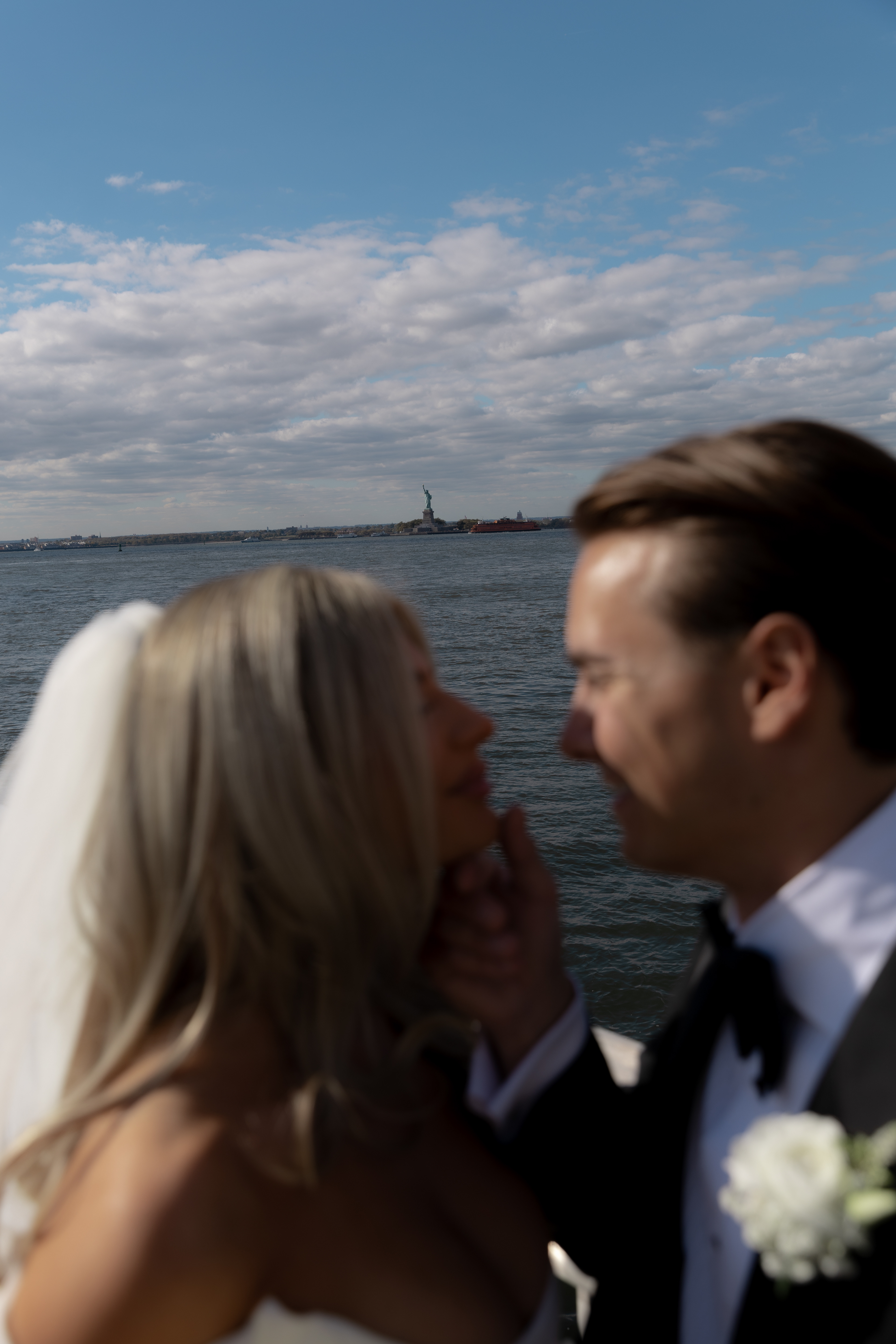 Their ceremony took place right on the pier, overlooking the harbor. The water was calm, and the skyline shimmered in the background as the sun started to dip. Guests sat facing the Manhattan view while Taylor walked down the aisle — it was one of those moments that felt still and cinematic all at once.