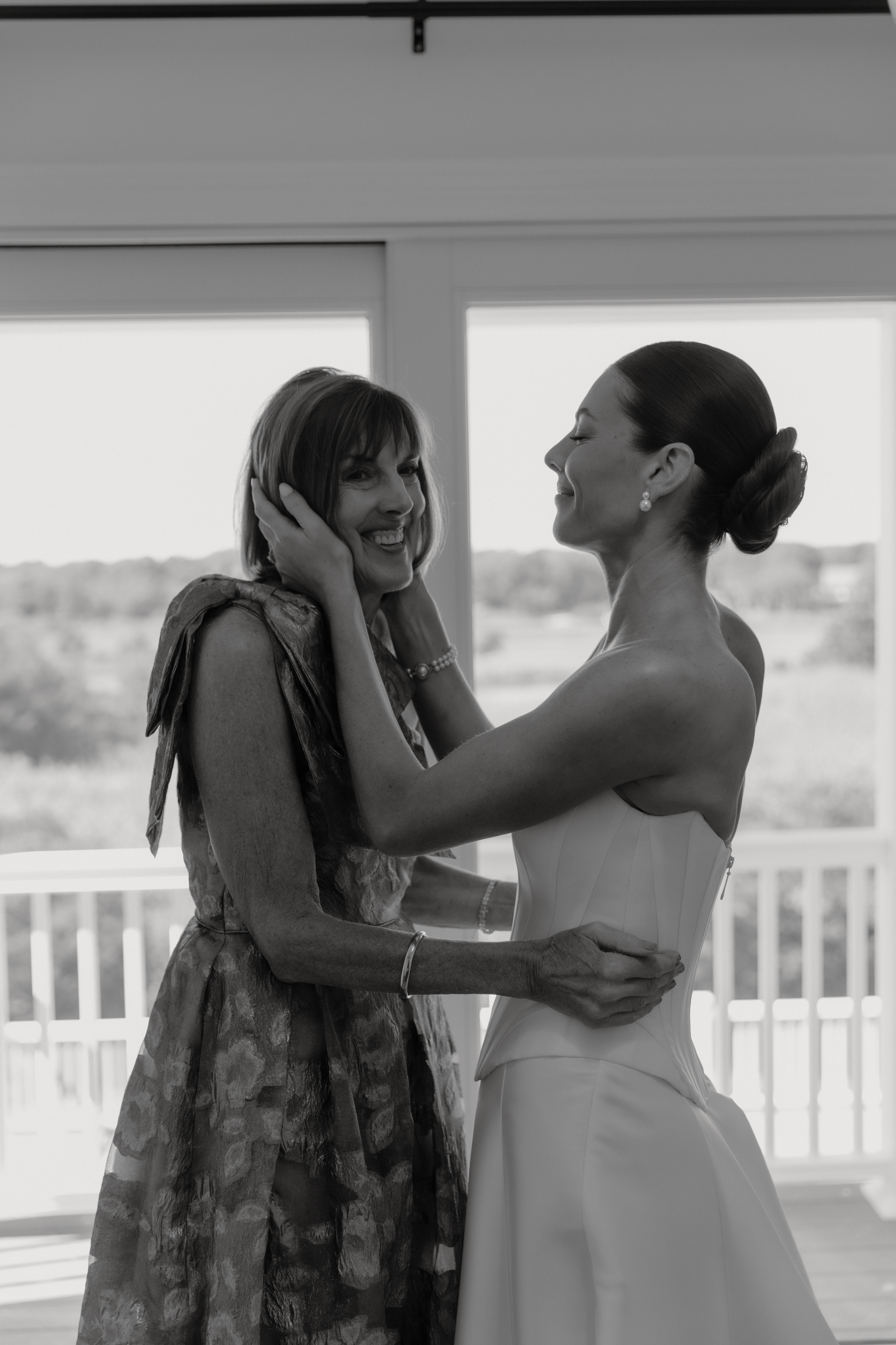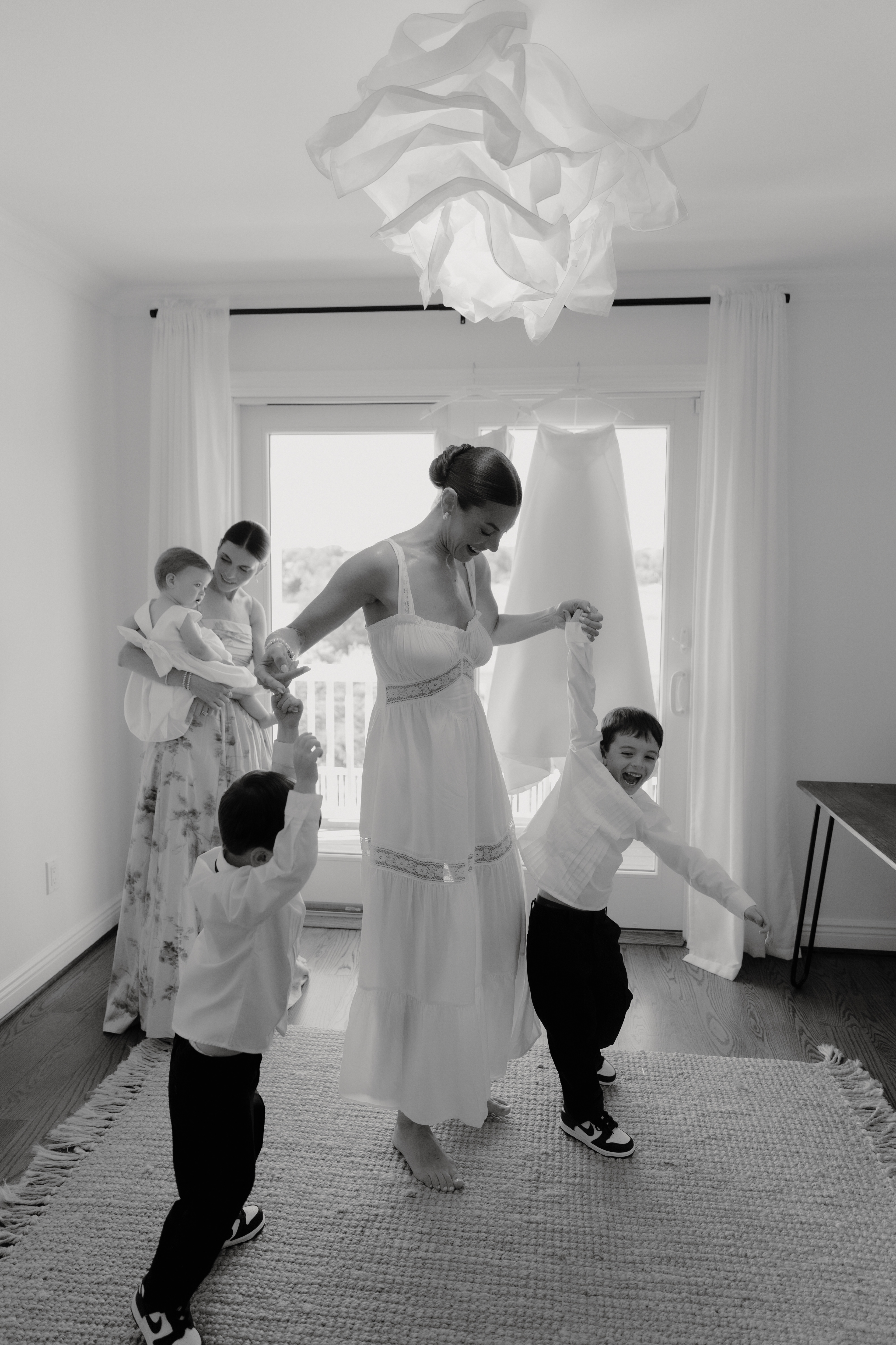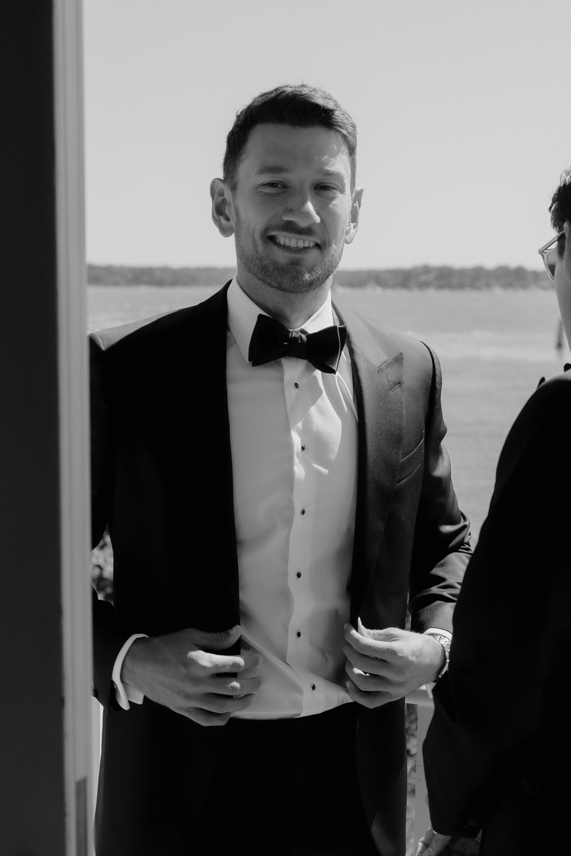 The morning of the wedding, Hope got ready at an beautiful house overlooking the marsh and water. The space felt peaceful and bright, filled with the energy of her nieces and nephews running around — the people she adores most. Thomas got ready nearby at The Harbor Front Inn, where he and his best friends looked out over the golf course and shared quiet moments before the day began.